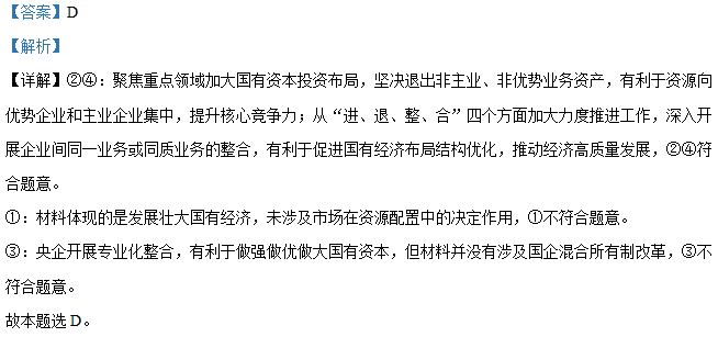 4. 专业化整合是央企间合并重组的主流模式,从“进、退、整、合”四个方面加大力度推进工作,包括聚焦重点领域加大国有资本投资布局,坚决退出非主业、非优势业务资产,深入开展企业间同一业务或同质业务的整合。央企开展专业化整合,有利于( )