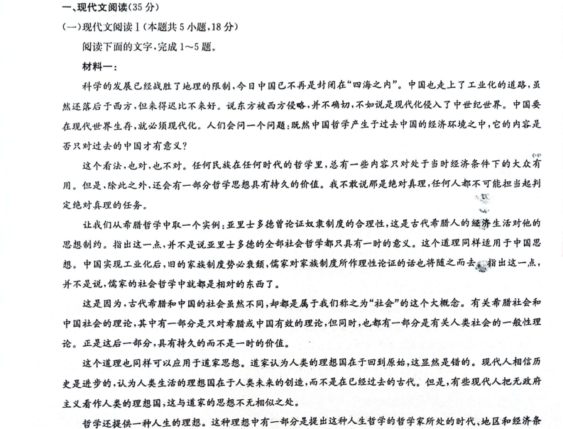 5.中国传统哲学产生于中国过去的经济环境中,但为什么对当代中国人仍具有重要的意义?请结合两则材料简要