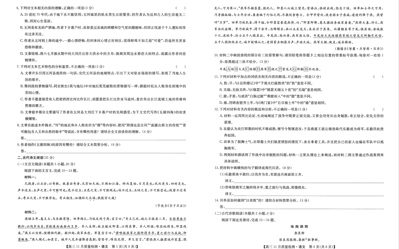 语文九师联盟高三11月试卷及答案2023-2024学年度